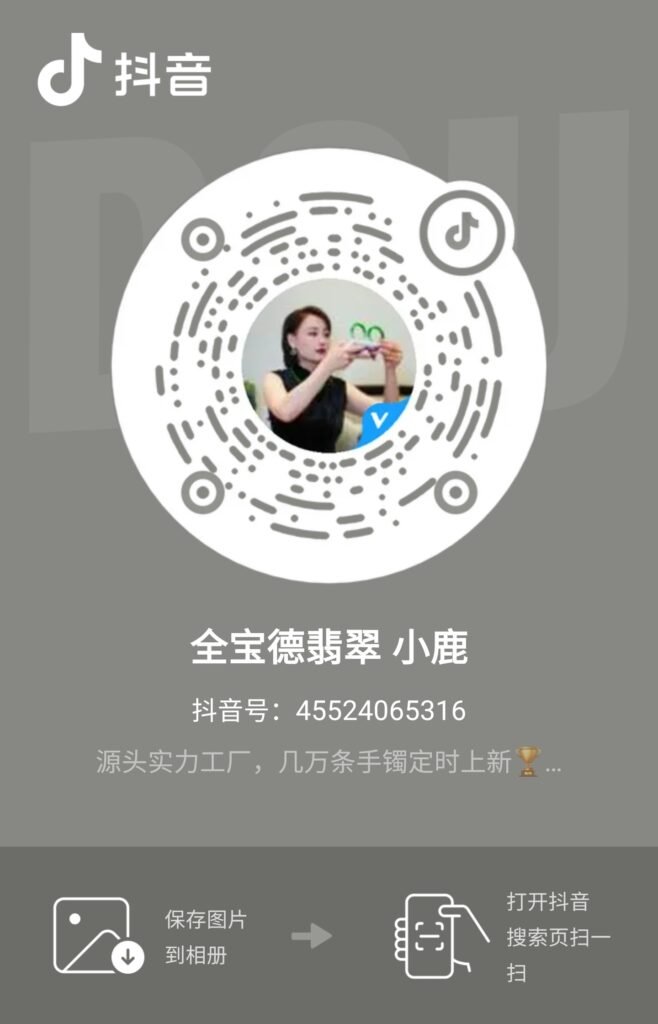 您好,海外的华人朋友。很感谢认识您! 这是我的微信二维码,请您扫码添加,请您务必备注来源海外。 我的日常直播都是在中国大陆的抖音平台上,请您用抖音扫码关注我,或者搜索“全宝德翡翠小鹿”